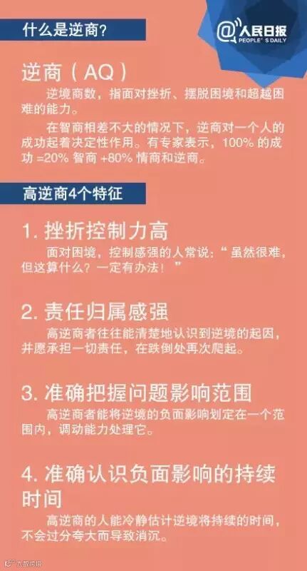 逆商(AQ),面对逆境承受挫折、超越困难的能力。巴尔扎克说:“苦难对于天才是垫脚石,对于能干的人是一笔财富,对于弱者则是一个万丈深渊。”提升逆商将让你充满正