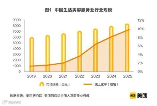 据美团2020年11月23日发布的《中国美容生活行业发展报告(2020)》,中国生活美容的市场规模为6373亿,每年的消费增速为15%+,女性消费顾客有1.2亿,消费客单值为137元。虽然生活美容行业消费市场存量及增长巨大,但消费者在线消费占比仅为1.5%,预计到2025年,中国生活美容服务行业的市场规模将达到8375亿,线上化率提升到9.6%左右。