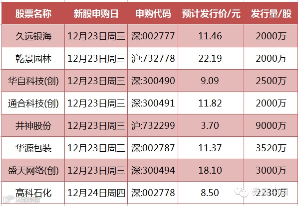 申购日期集中在12月23日(下周三)。其中7家新股将于12月23日(下周三)进行网下网上申购。仅有高科石化一家在12月24日申购。这8家新股的净募资在22亿元左右,对应15亿元左右的网下申购资金上限。