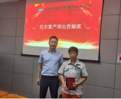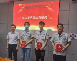 邹志东讲述了在抗灾复产工作中,表现突出的优秀个人的先进事迹,并宣读了表彰决定。随后,邹志东、唐志成为与会的获奖员工代表颁发了“抗灾复产突出贡献奖”和“抗灾复产优秀员工”的荣誉证书。