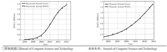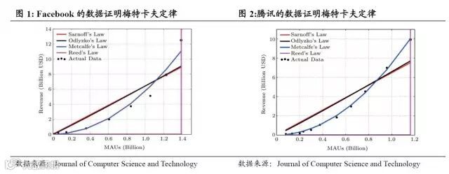 梅特卡夫定律是由以太网的发明者3COM公司的创始人,计算机网络先驱罗伯特?梅特卡夫(Robert Metcalfe)于1973年提出的。该定律在计算机领域的地位和摩尔定律一样重要。梅特卡夫定律是说:网络的价值与联网的设备数量的平方成正比。 梅特卡夫定律认为互联网的价值在于将节点连接起来。而节点越多,潜在存在的连接数越多。如果节点数是N,其中存在的连接数数可能是N*(N-1),即N2这一数量级。网络的价值与节点的平方成正比。 梅特卡夫定律提出40年以来,学术界对其有不同的观点,但一直并没有特别好的实证。2014年梅特卡夫教授自己发布了一篇文章,其利用Facebook的数据对梅特卡夫定律做验证,并发现Facebook的收入和其用户数的平方成正比。中国有学者亦采用相同的方法,验证了腾讯的收入和其用户数的平方成正比。梅特卡夫定律得到了非常好的验证(下图中蓝色线条展示了梅特卡夫定律的拟合结果)