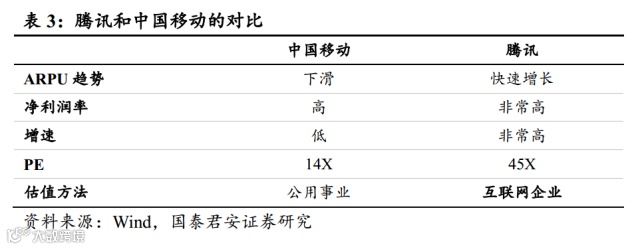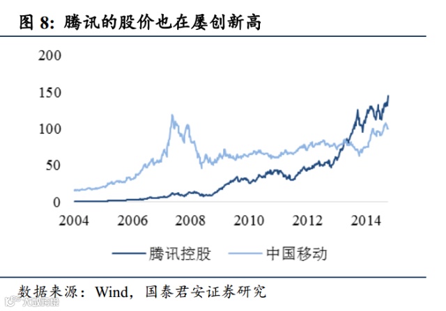 中国移动2014年的收入为5818亿元(人民币,下同)、净利润为1093亿元;而腾讯的收入只有789亿元、净利润为238亿元。中国移动的收入是腾讯 的7.4倍,净利润为腾讯的4.6倍。但收入和利润上的巨大差异,在市值上却体现地并不明显。中国移动的市值只是腾讯的1.5倍,相应地,腾讯的市盈率基 本是中国移动的三倍。腾讯和中国移动的用户数基本是在一个体量上,但市场对他们的看法也仍有很大不同。