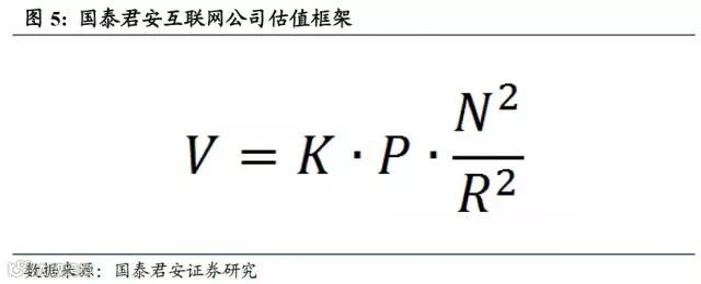 5.我们给出了国泰君安互联网公司估值框架:V=K*P*N^2/R^2。V是互联网企业的价值;K是变现因子、P是溢价率系数(取决于企业在行业中的地位)、N是网络的用户数、R是网络节点之间的距离。