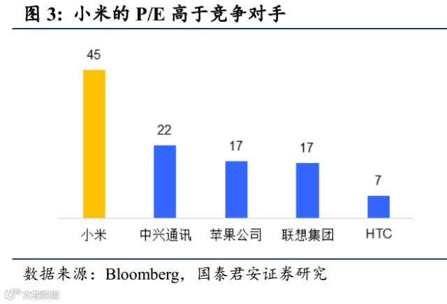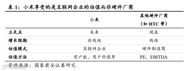 小米向投资者呈现的商业模式是一个美丽的生态系统。小米强调“硬件+软件+服务”三驾马车,MIUI、小米手机、小米路由器、小米盒子等等诸多产品实际上是 个一体化的用户生态系统(见国泰君安策略“商业模式系列报告第四篇《软硬一体化,“小”虾”米”玩转大生态》“)。这个系统有一些很好的对标,如苹果、腾 讯、阿里巴巴等等。这种生态系统可以牢牢地占据市场中的一席之地,享受稳定增长的盈利能力且不会被轻易地替代。一般的应用级公司差不多能做到十亿美元规模 就已经很大了、平台型的公司市值可能达到百亿美元,而真正的大型生态系统级公司往往都可以达到千亿美元级别的市值。各个阶段的投资者(从天使轮到A、B、 C轮..),都会在概率的基础上为这个故事买单。——而他们对硬件厂商只会看盈利。