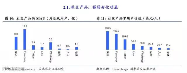 聚焦于中国的社交产品,腾讯一家独大,且体现出了明显的规模效应。但需要提示的是,这里的单用户价值实际上计算了腾讯的游戏等收入,并非仅仅QQ或微信。单纯的社交产品如新浪微博等,由于没有好的变现模式,单用户价值并不高。仅有15.4美元。