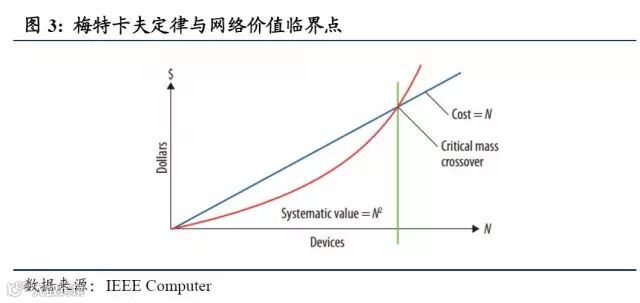 如果一个网络本身只是一个中心联系众多用户,这种网络的价值实际上并不高。而类似像腾讯、Facebook这种节点和节点间有着较多联系的网络价值会高很多。有机会实现梅特卡夫定律所预测的平方级增长。