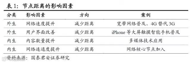 3.网络的价值不仅和节点数有关,也和节点之间的“距离”有关。网络节点之间的距离由科技进步和基础设施建设外生因素和网络的内容、商业模式等内生因素共同决定。