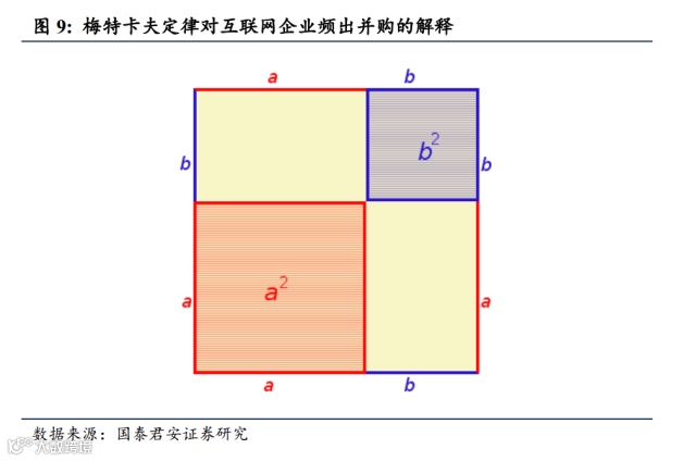 4.互联网是开放的,但并不平等。互联网的一个重要特征就是赢者通吃。梅特卡夫定律告诉我们网络的价值与用户数的平方成正比,这意味着用户数相差不多会导致网络价值相差很多。进一步地,落后者未来获得新用户、新资源的机会都要比领先者要小。梅特卡夫定律加剧了互联网的马太效应。因此,投资者往往会极为重视互联网企业的行业地位,他们会愿意付出高溢价来购买领先者的股权。