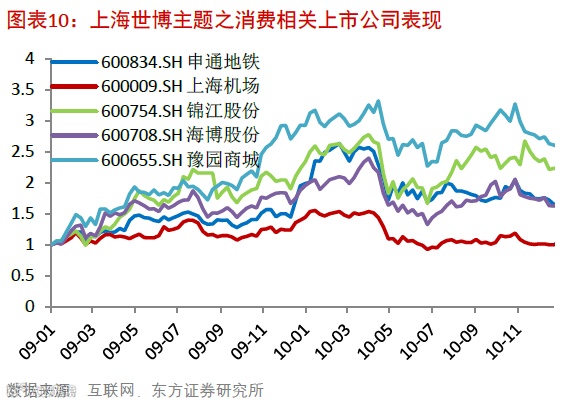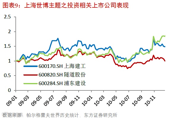上海世博会的主题投资也与此类似,在投资和消费两个方向带来主题性投资机会。在世博会的筹办阶段,经济影响主要表现在大规模的城市基础设施建设投资对经济的拉动作用,其中场馆建设,交通基建等行业的投资额度占的比重较大,具体受益行业有:基础设施、机器设备、建筑,房地产;在举办阶段,主要表现为迅速增长的旅游、会展和消费对经济的拉动,具体受益行业有:旅游、零售、食品、物流;在会后阶段,则主要表现在投资与消费需求的回落和场馆设施的后续利用对经济的影响。主要受益的上市公司包括上海建工、隧道股份、浦东建设、申通地铁,上海机场、锦江股份、海博股份、强生控股、豫园商城、新世界、上实发展等。