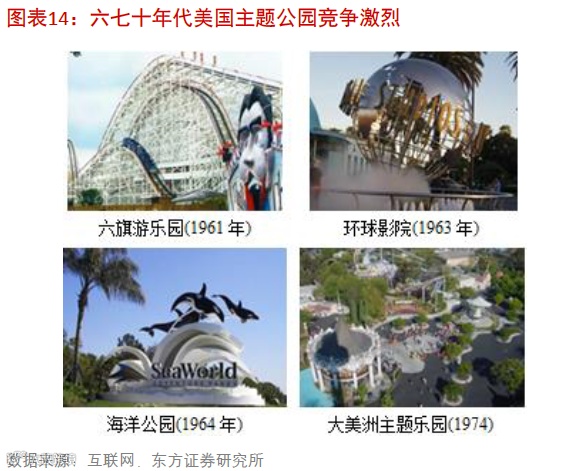 迪斯尼乐园最早诞生于1955年的美国加州,这种把人们钟爱的电影角色,比如米老鼠、唐老鸭、白雪公主和彼得•潘和游乐场、电影院、玩具店、纪念品商店、书店等多种业态相结合的新商业模式,当时取得了巨大的成功:开园近7个星期,游客接待人数即达到100万,开业四年共吸引游客1500万人次,截止1971年,累计游客数超过1亿,70%以上的游客会二次光顾;这也为迪斯尼公司带来了丰厚的收入;乐园开业的首年,公司总收入从600万美元跃进到2700万美元,到20世纪50年代末,这一收入达到了7000万美元。