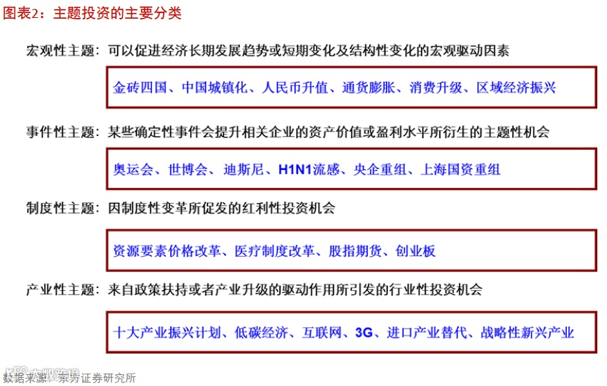 从投资机会的触发因素看,主题投资主要分为宏观性主题、事件性主题、制度性主题和产业性主题。