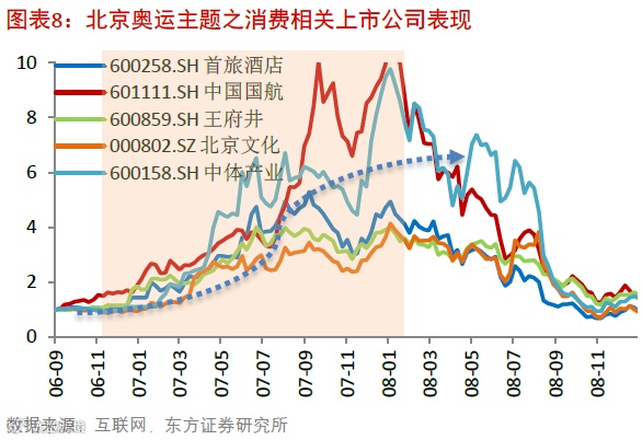 除了土地升值属于较为长期的影响外,投资驱动带来的影响更多是一次性的,对企业长期影响较小。因此,这些投资驱动的受益公司业绩多数在奥运前两三年就已经开始表现,其市场表现亦在奥运举办前一年即已达到相对顶峰。