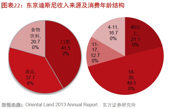 日本人有相互赠礼的习惯,同时动漫文化也使日本人比较认同和接受衍生品的消费,正是基于这种对日本文化的认识,东京迪斯尼大力开发衍生产品。目前,东京迪斯尼乐园人均游客消费11076日元,其中门票收入贡献4598日元,食物、饮料收入贡献2292日元,而消费品收入贡献4185日元,占比高达38%。餐饮和消费品之处之和超过传统的门票收入,证明迪斯尼乐园在产品研发方面取得的成功。