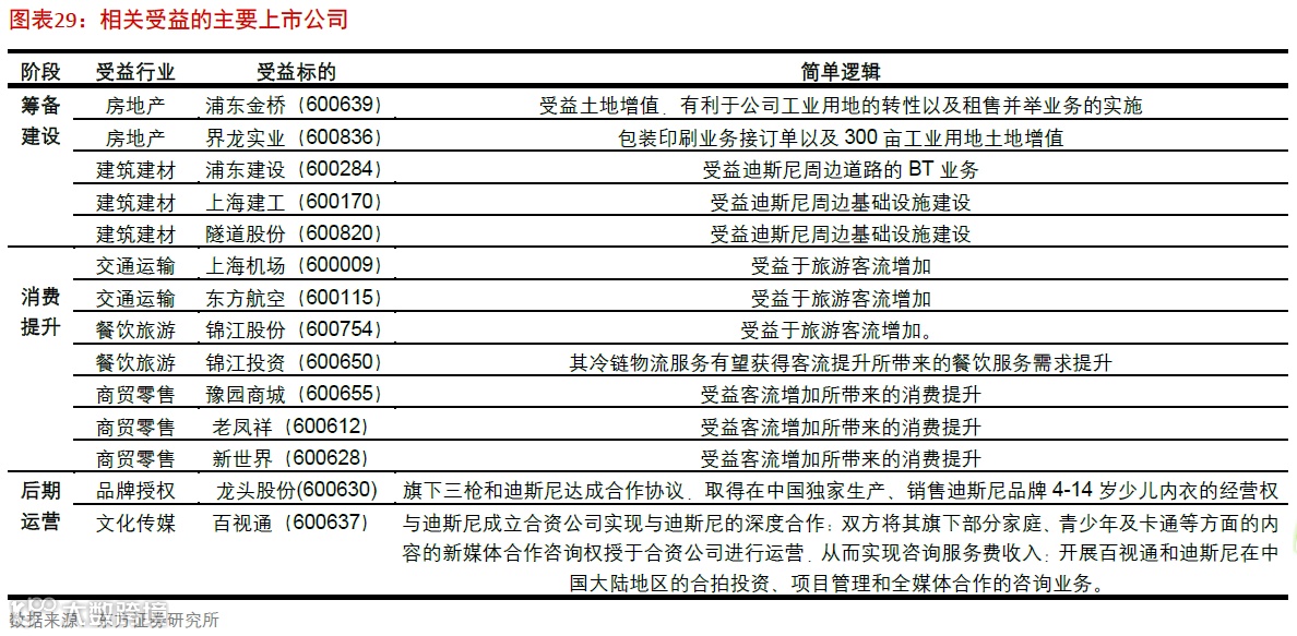 1) 房地产。迪斯尼项目实施带来当地经济繁荣,最显著的效应将是在品牌效应和配套建设预期下,当地房价和地价的暴涨。从住宅市场来看,迪斯尼的落户对市场具备长期效应。周边配套必将逐步成熟,对当地住宅市场将产生长期的利好,必然有增值效应,周边土地功能将出现调整,先前的工业用地可能调整为商业用地。
