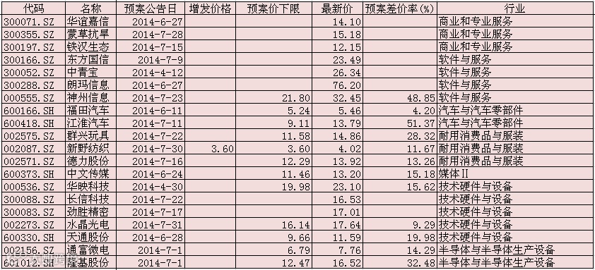 我们对2014年1月1日开始到2014年7月31日已经公布定增预案,而目前仍处在预案阶段的154家上市企业做个统计。首先在剔除向特定对象增发外,符合中国证监会规定的证券投资基金管理公司,证券公司,信托投资公司,财务公司,保险机构投资者,合格境外机构投资者(QFII)以及其他境内法人投资者,自然人等等能参与的只有58家上市公司。其次根据行业选择较稳定和近期收益较好的媒体II、商业和专业服务、软件与服务、耐用消费品与服装、技术硬件与设备等行业个股。
