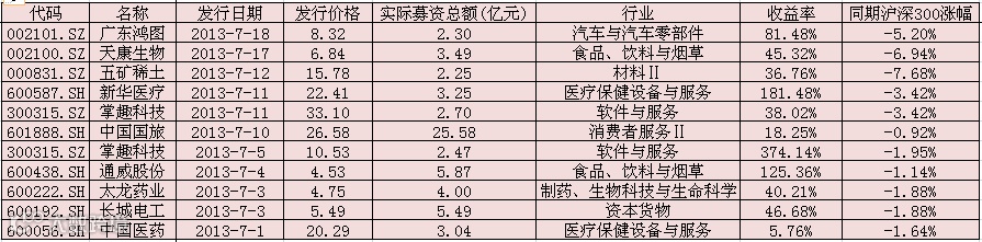 2013年同期(7月1日到7月18日)实施定向增发,机构投资者锁定1年后,本月达到解禁的个股如上图表。截止到2014年7月18日1年前参与这11家定增的个股收益率(收盘价相对于发行价(复权后))全部为正,而且收益率除了个别的低于20%外,普遍收益超过40%,甚至1年内收益回报有高达374%、181%和125%的超级暴利。而同期沪深300指数都是呈现下跌走势。相比来看:参与定向增发的大资金投资者解禁后盈利比投资二级市场上股票概率获取的回报要大的多。当然我们不可否认从2013年7月到2014年7月股指处于横盘震荡,沪深300指数只是微幅下跌,个股轮流绽放,整体行情没有处于熊市。因此定增个股全部实现正收益,但这并不代表任何时候参与一级市场的定增都100%有正收益。参与定增也是有风险的,同时不同的行业个股定增之间差距巨大,需要我们重点去研究。