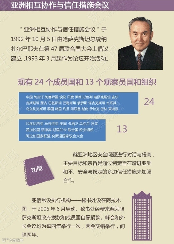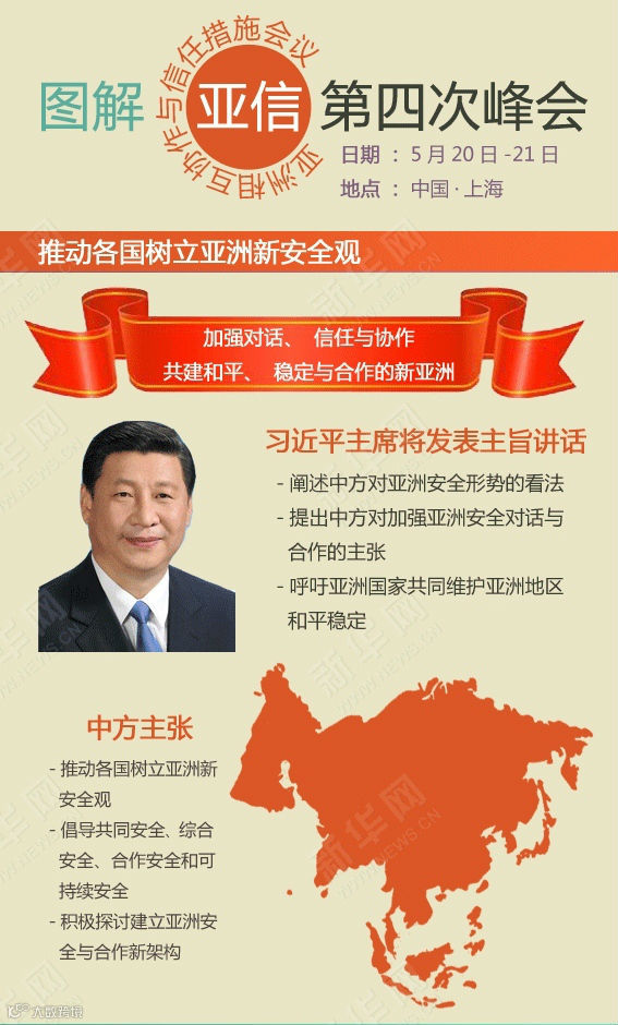 第四次亚信峰会于2014年5月20日至21日在上海举行,此次峰会主题为“加强对话、信任与协作,共建和平、稳定与合作的新亚洲”。此次峰会,中国将接任2014-2016年亚信主席国。
