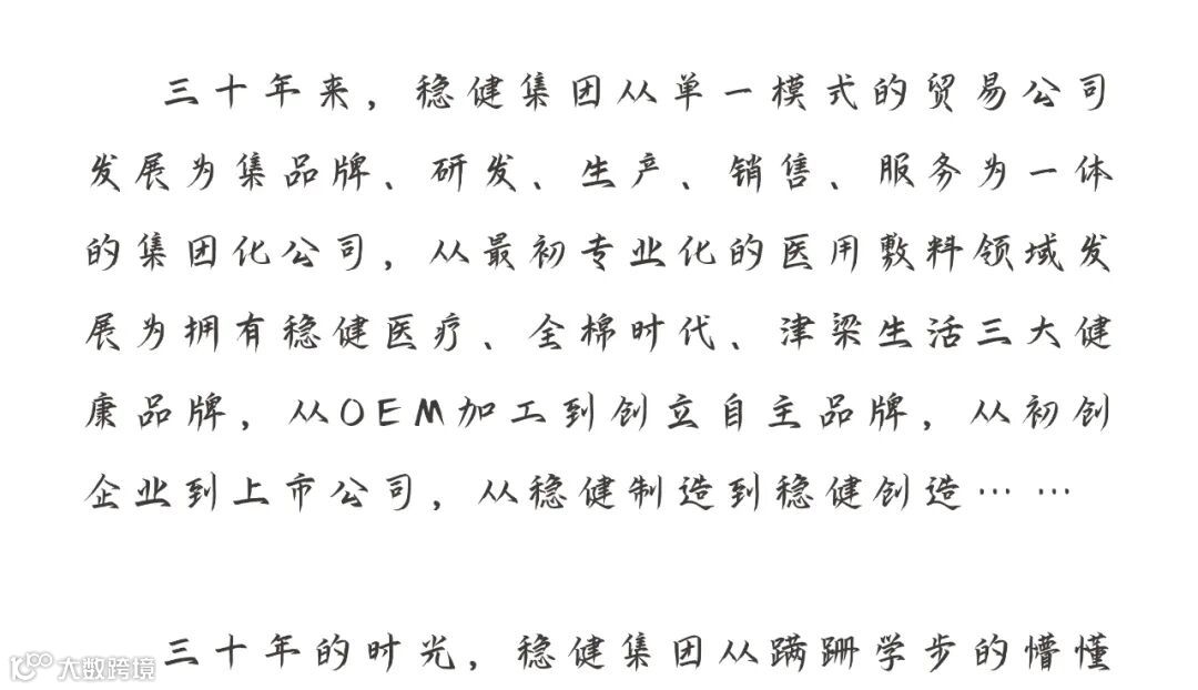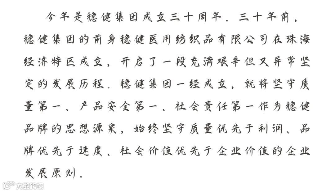 稳健医疗用品股份有限公司(以下简称稳健集团)从创立至今,已走过三十个年头。回望过去,我们一路披荆斩棘、开拓创新,用行动为中国制造正名;三十而立,我们乘风破浪、继往开来,“winner稳健医疗”“Purcotton全棉时代”“PureH2B津梁生活”三大品牌共同谱写大健康新篇章!