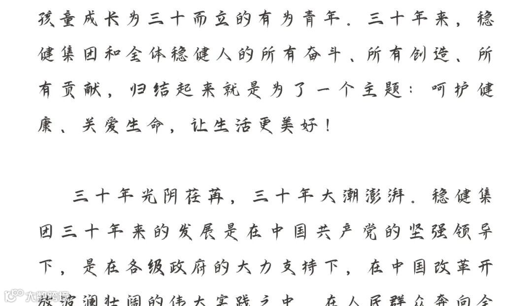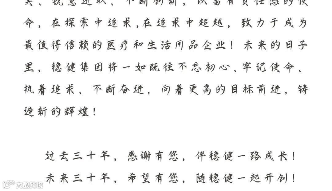 稳健集团三十周年将围绕“呵护健康每一天,关爱生命每个人”大主题,开展一系列活动,向世界讲述稳健故事、传递稳健精神、回馈社会关注、感恩一路同行。在此,稳健集团再次感谢党和政府的领导与支持,感谢投资人、客户、合作伙伴、员工的信任与陪伴。您的支持让我们有信心、有力量走得更高更远!