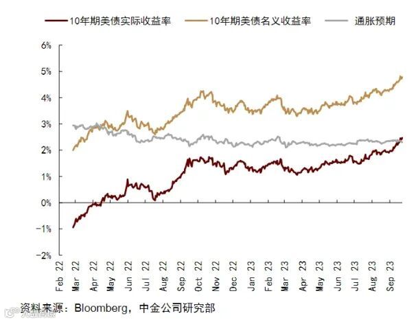 美股由于前期涨幅较大且长期利率快速升高,调整更明显,标普500和纳指100分别调整-5.11%和-5.88%。美国9月PMI和非农就业数据显示其增长与就业仍保持相对韧性,多位美联储主要官员发表偏鹰派讲话,受此影响市场对年内美联储再度加息的预期升温,十年期美债利率上升至4.9%附近,达到2007年以来的最高位置,而且美元指数也在走强。美债利率较长时间高位对全球资本市场将带来持续影响,对新兴市场有一定的资金面冲击。