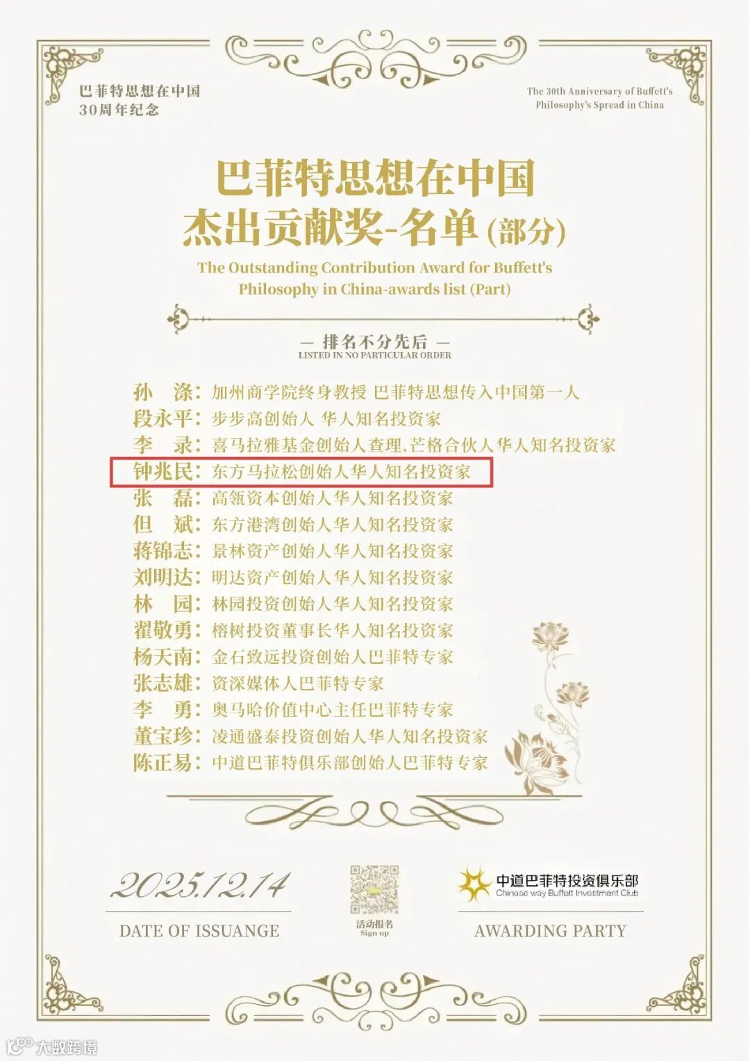 中道巴菲特投资俱乐部及巴菲特思想在中国30周年纪念大会组委会,设立:杰出贡献奖。