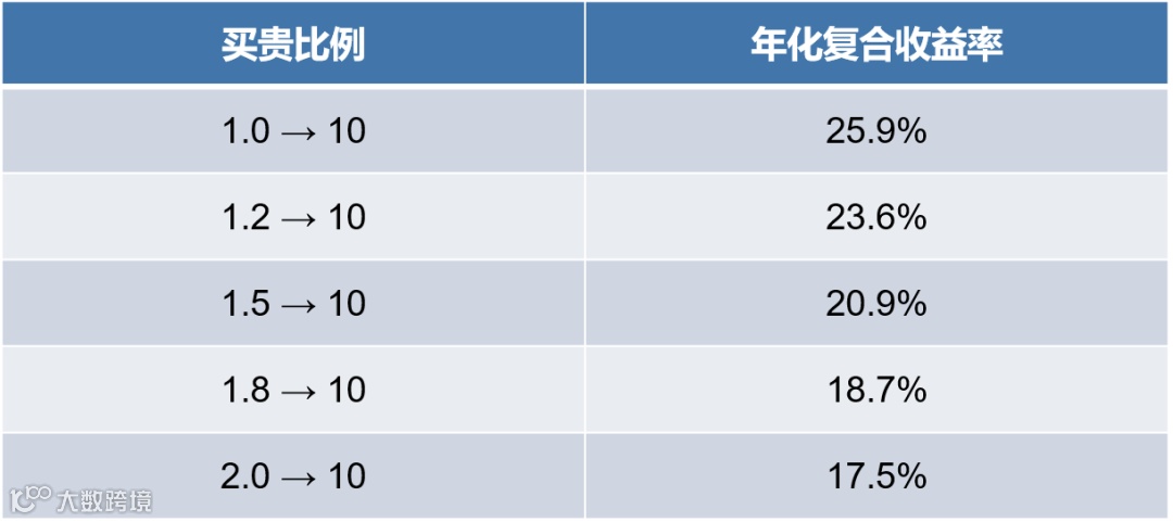 我们用一组数据证明假如一家公司的成长空间足以达到10年10倍,那么即便初始成本买贵了一倍,收益也是很可观的(年化17.5%)。