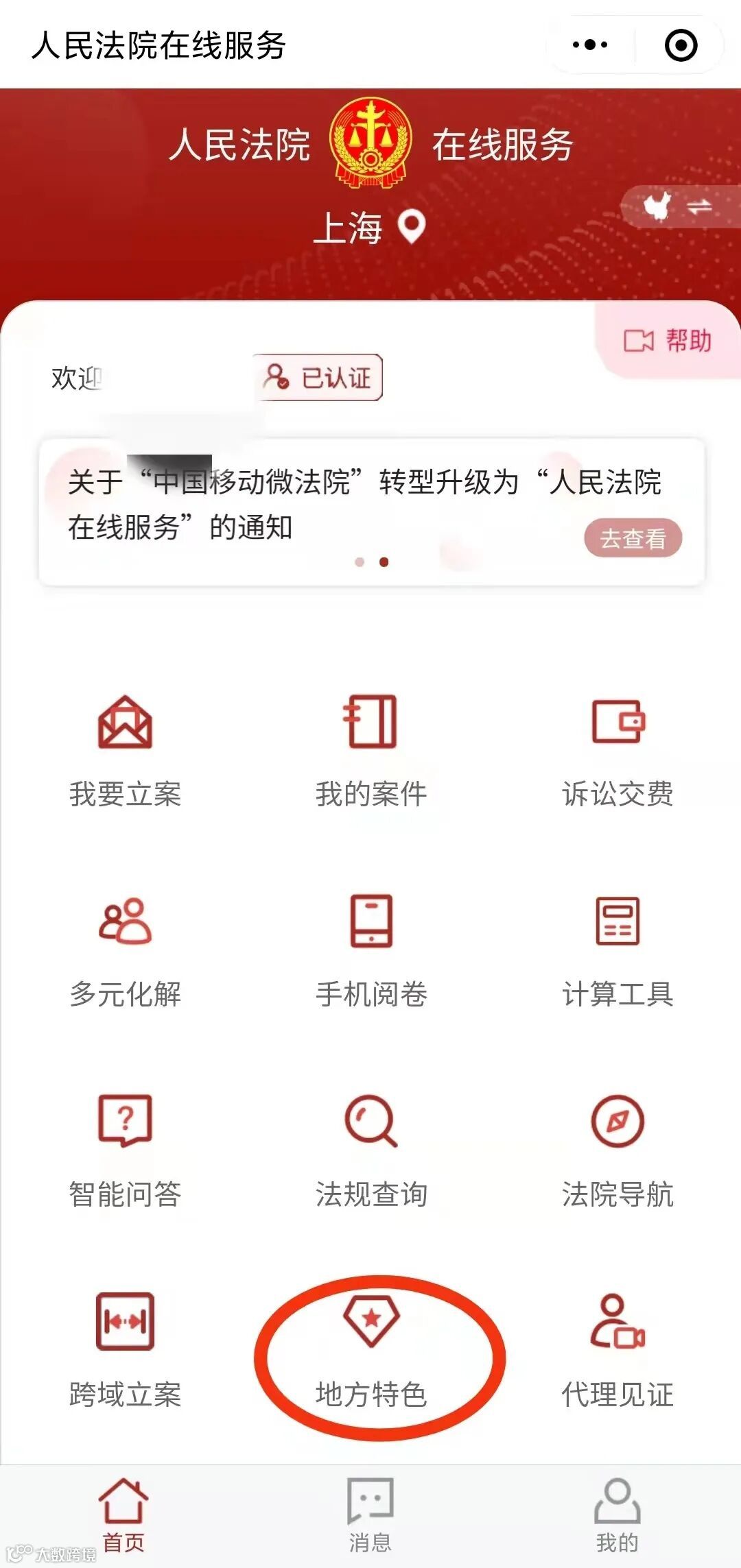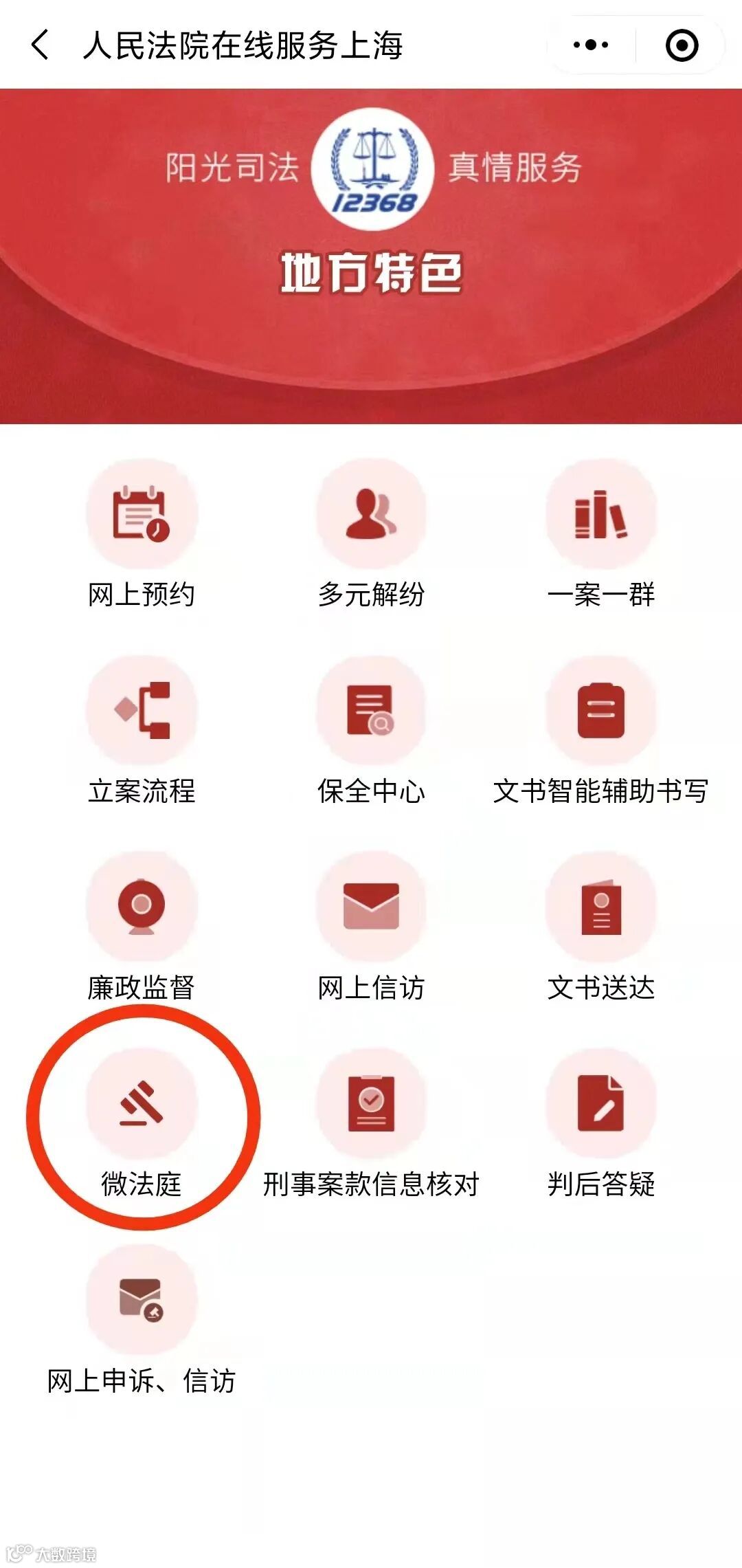点击“地方特色”,进入“微法庭”。