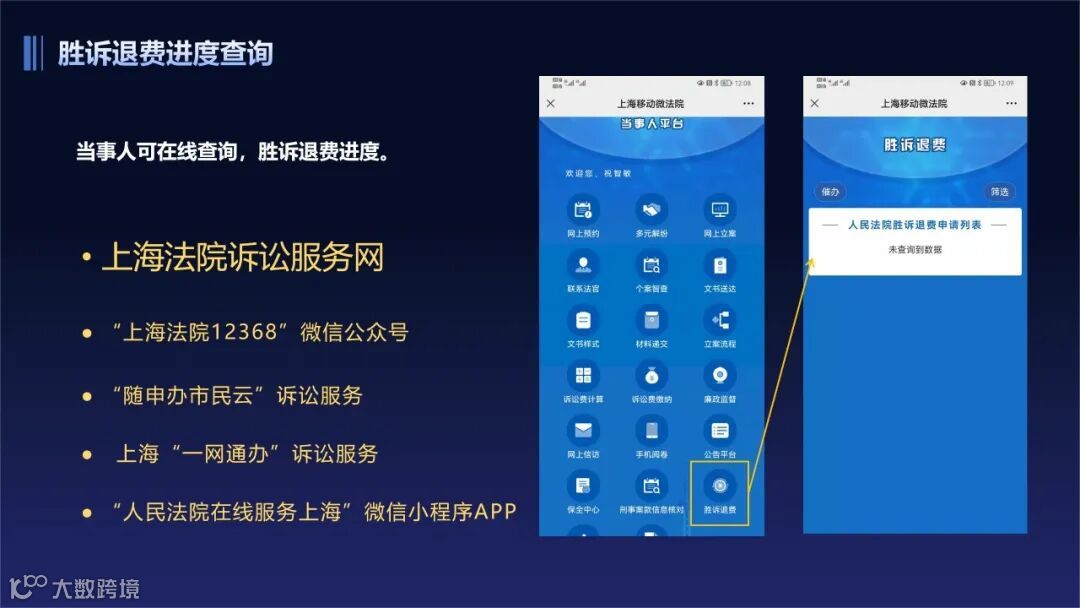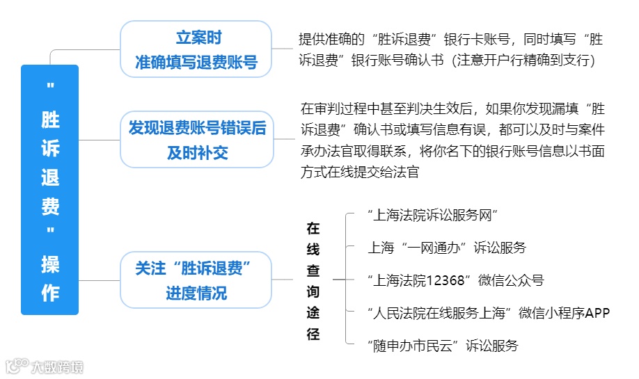 诉讼过程中,你可以通过“上海法院诉讼服务网”、 上海“一网通办”诉讼服务、“上海法院12368”微信公众号、“人民法院在线服务上海”微信小程序APP、“随申办市民云”诉讼服务,在线查询“胜诉退费”进度,及时了解“胜诉退费”情况。