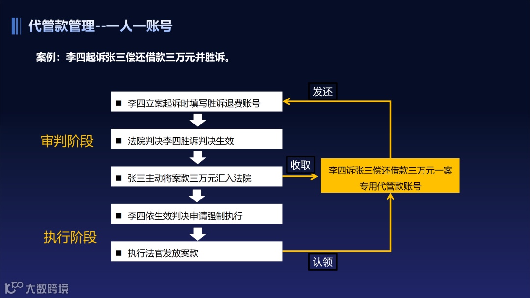 在法院的案款管理系统中,有一个“一人一账号”功能,也就是同一当事人在同一个纠纷进行诉讼、执行过程中的代管款账号为同一个,专款专管,从收取、认领到发还全流程闭环管理。