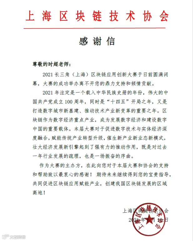 今年是长三角(上海)区块链应用创新大赛举办的第三个年头。上海金桥信息股份有限公司连续三年积极参与协会及大赛的各项组织活动,为区块链技术的创新发展贡献了自己的力量。近日,上海金桥信息股份有限公司政法行业技术总监时超先生收到了上海区块链技术协会的感谢信,感谢时总对区块链技术协会工作的大力支持与对区块链技术发展做出的积极贡献。
