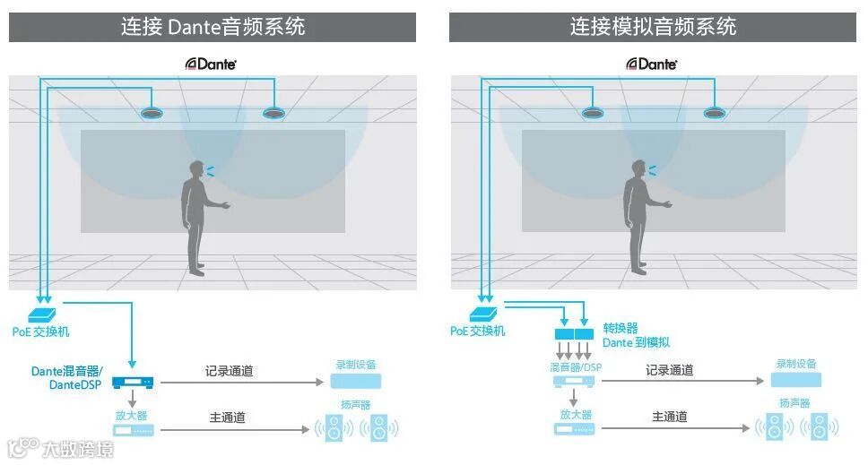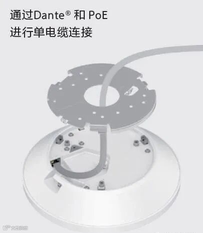 MAS-A100支持Dante®和PoE,可通过一根电缆与第三方系统连接: