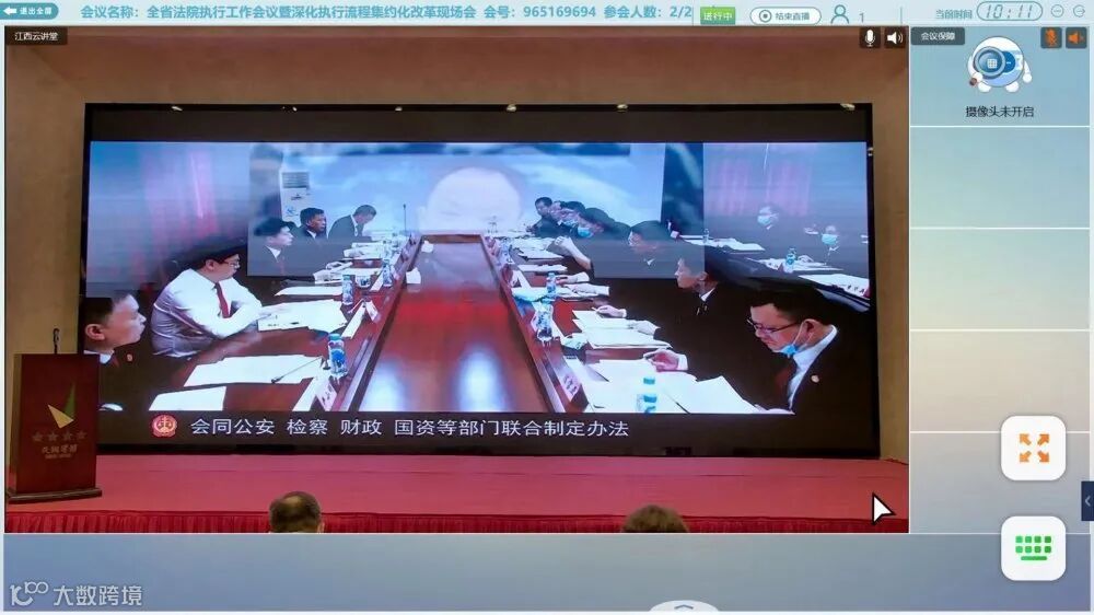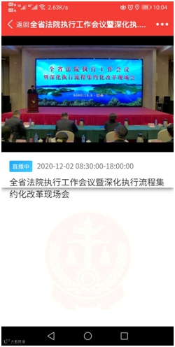 12月2日,江西高院执行局召开“全省法院执行工作会议暨深化执行流程集约化改革现场会”。此次会议是江西法院首次通过智慧执行APP中的执行头条“首播功能”对全省法院干警开展的一场执行流程集约化改革直播培训。江西法院积极借助大数据、云计算、人工智能、区块链、5G等现代信息技术,促进科学技术与执行工作的融合发展,实现了执行工作模式的深刻变革,有力促进了法治江西、诚信江西建设,切实提高了执法办案整体能力和水平,推动了执行工作模式迭代升级,全面提升了司法公信力和群众获得感。