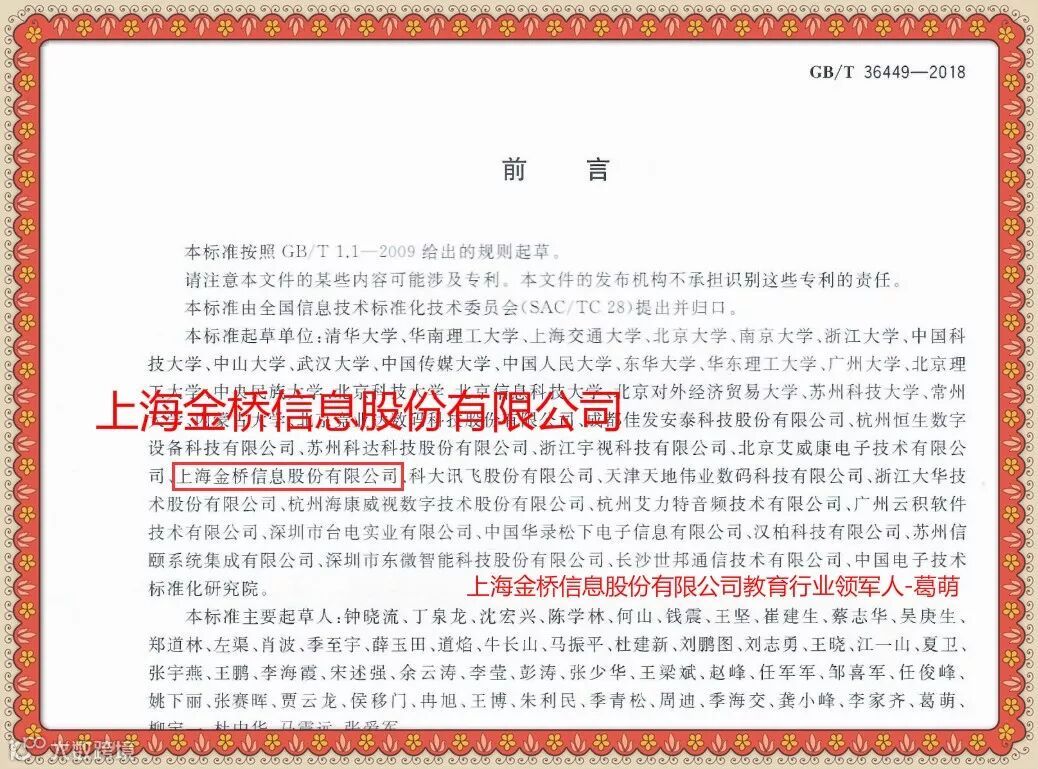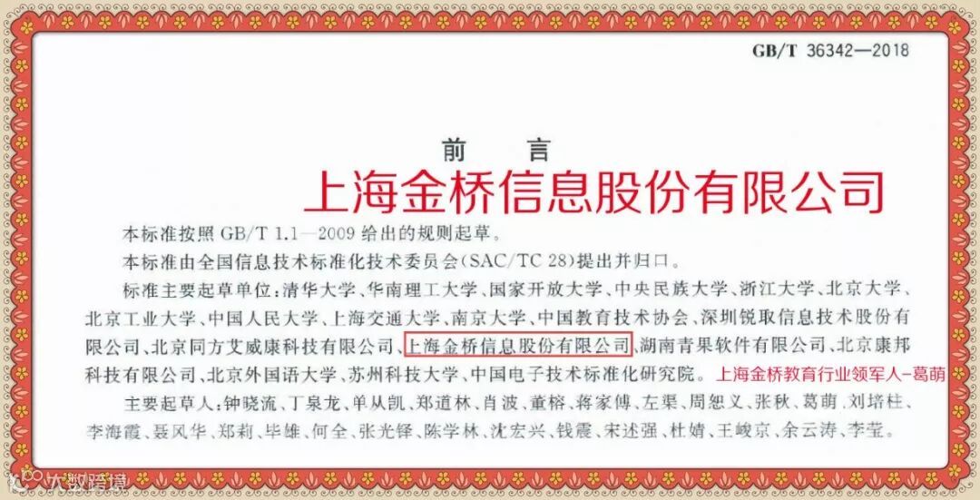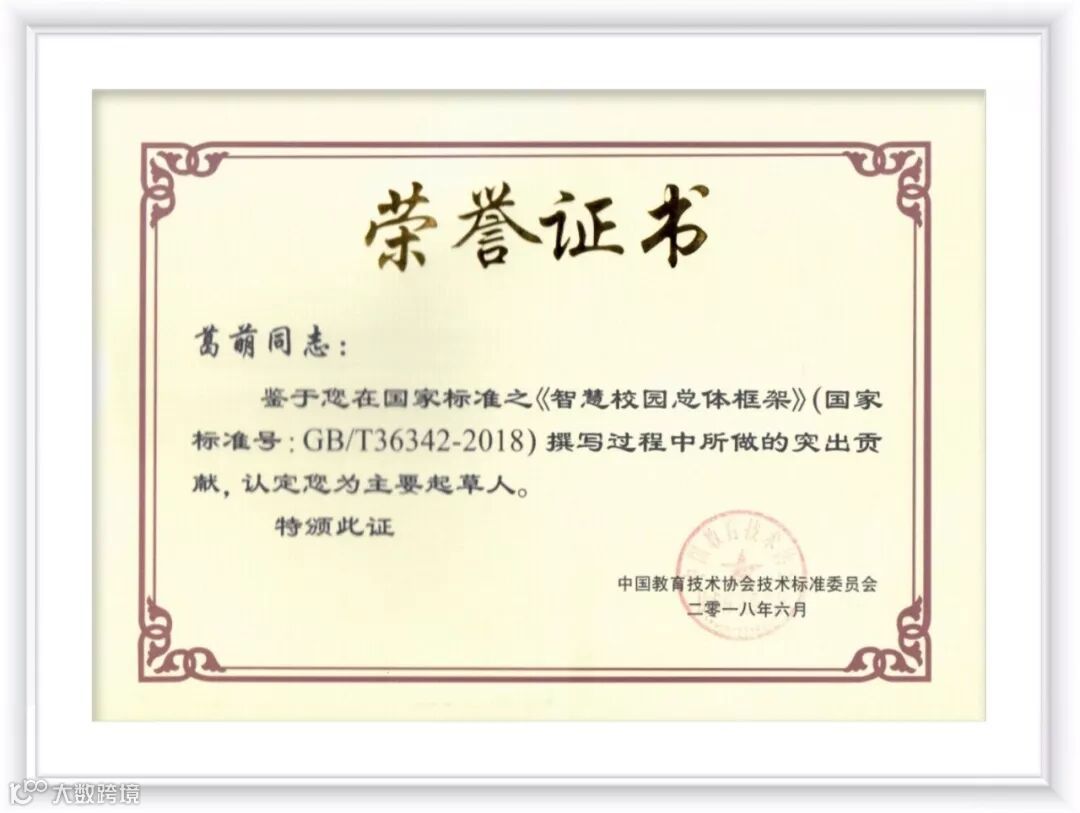 近日,上海金桥信息股份有限公司教育行业领军人--葛萌先生因在《智慧校园总体框架》国家标准文件的起草中所做出的突出贡献而获得中国教育技术协会技术标准委员会奖励并颁发荣誉证书。