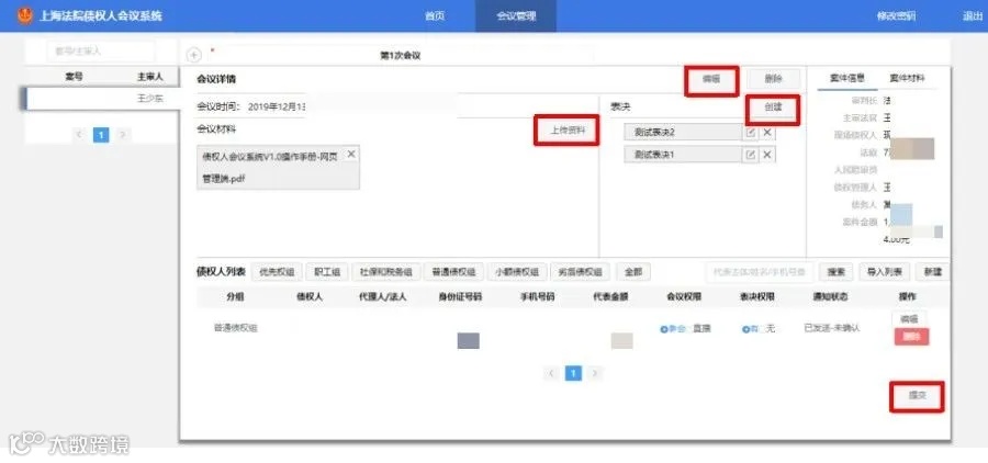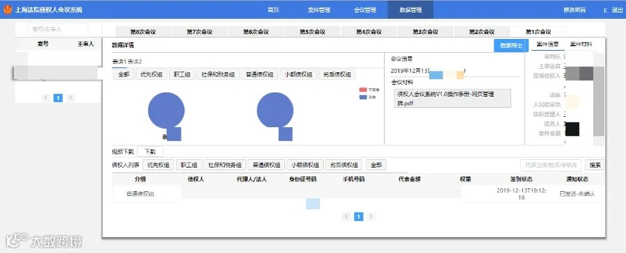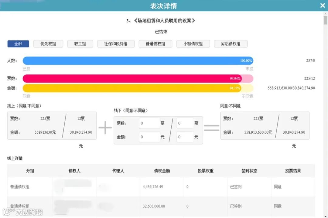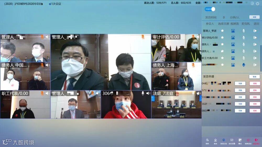 3月某日,上海破产法庭召开某集团公司破产案件第一次债权人会议,法庭内是合议庭、管理人和债务人代表,而600余名身处各地的债权人则通过网络参加会议,这是上海破产法庭成立以来采用网络方式召开债权人会议涉及人数及金额最大的一次。为了使每一位债权人的权利得到充分行使,在每个议案流程结尾,添加了债权人提出异议环节,所有线上债权人都可以申请发言,面对面地与法官、管理人陈述异议,合议庭及管理人当场为债权人解答。由于案件重大,表决事项需给参会债权人留出充足时间考虑,也要充分考虑部分未参会债权人的权利行使,合议庭决定线上发起四项事项表决,采用延期三天表决的方式进行,所有债权人可通过债权人会议软件在规定时间内行使自己的权利。系统会自动记录表决数据。所有线上产生的音视频、表决事项结果等资料,随案件卷宗附录,真实有效。