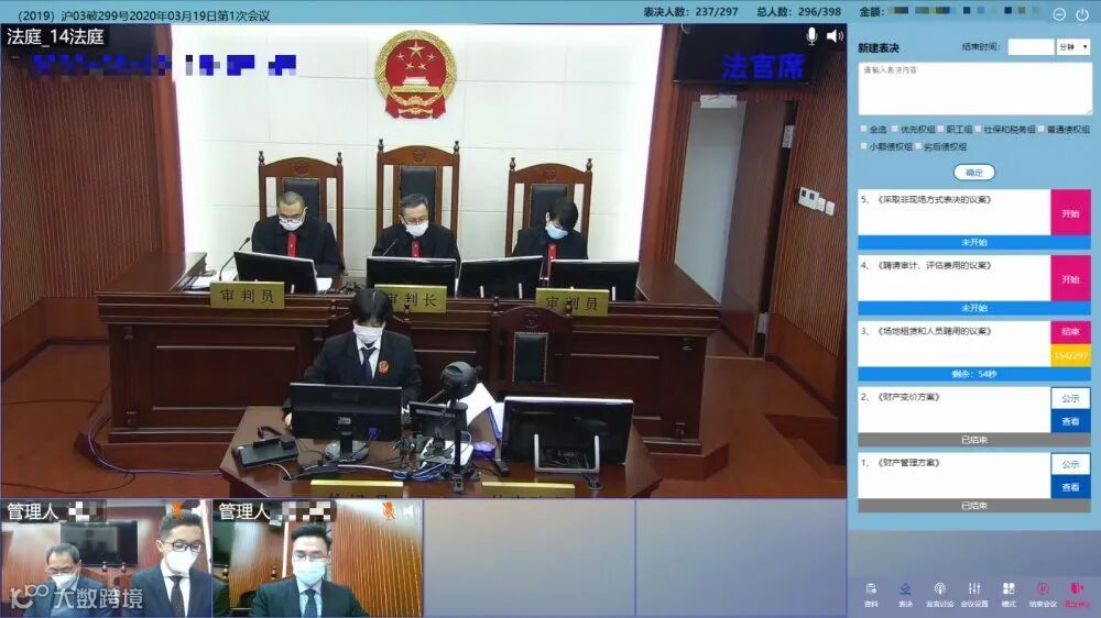 3月某日,上海破产法庭如期召开了上海一家文化公司的网络债权人会议,由于此次债权人会议涉及债权人数量多,分布地域广,许多债权人涉及债权金额比较多,影响力较广,在疫情防控的攻坚时期,为了响应当前防疫工作的要求,减少当事人不必要的出行,会议在合议庭主持下,398名债权人参会,参与表决人数237人,对财产管理方案、财产变价方案等五项议案进行了汇报以及线上表决,最终高效完成所有表决事项,实现足不出户参与会议全过程,避免人员聚集带来的传染风险,切实保障了此次案件各项流程高质量、高效率、安全有序地推进。