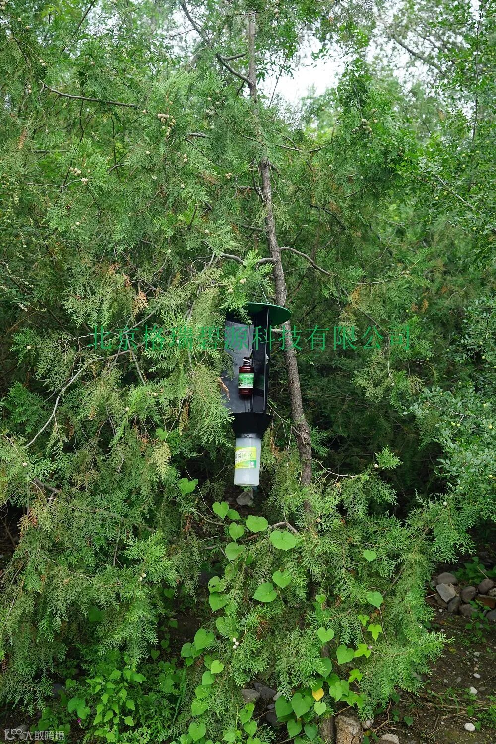 将三面挡板用随配的小圆柱凹槽上下插入固定形成120°夹角的三面挡板,再将挡板和顶盖用3颗螺丝钉拧紧固定,挡板下端与漏斗锁扣处卡紧,再将收集桶和最下面的一个漏斗组装好之后,悬挂于两松树之间小木棍(或铁丝)上(两端分别固定在两株松树上),诱捕器挂在木棒中间绑牢,诱捕器下端离地面1.3米左右,诱捕器中间方口处悬挂双条杉天牛引诱剂,引诱剂与诱捕器配套使用。