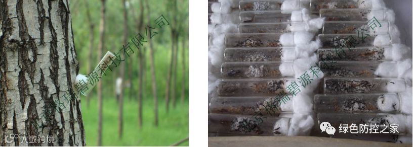 1 使用双条杉天牛引诱剂和漏斗或挡板诱捕器,将诱捕器悬挂在离地约1.5m的粗树枝上,引诱剂每月更换一次,定时清理害虫。