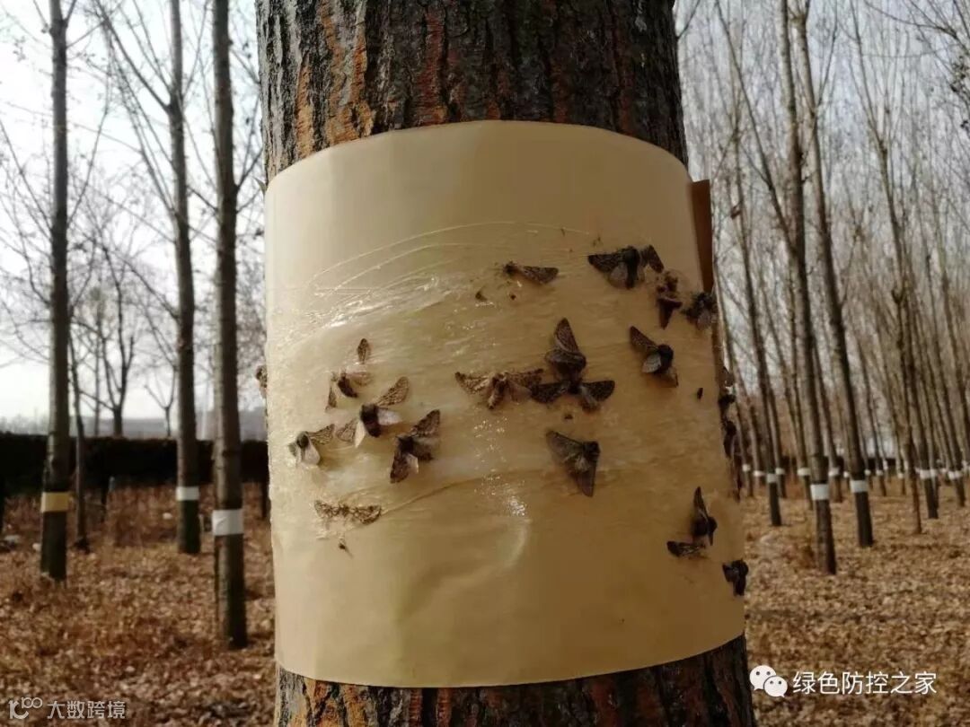 1.使用粘虫胶及胶带围环。每年1月中旬开始提前将胶带围环直接缠在距树基部1.2m高的树干1-2圈,2月中旬围环刷一层胶环。据2019监测,2月20-25号春尺蠖成虫开始出蛰,月底成虫大量出现。