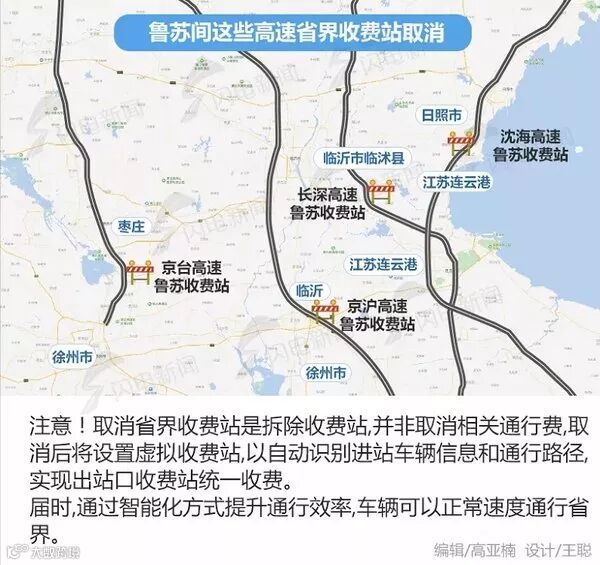 齐鲁交通发展集团所属沈海高速(G15)、长深高速(G25)、京沪高速(G2)鲁苏收费站,山东高速集团所属京台高速(G3)鲁苏收费站,中铁建济鱼公司所属济徐高速(山东S33,江苏S69)鲁苏收费站。
