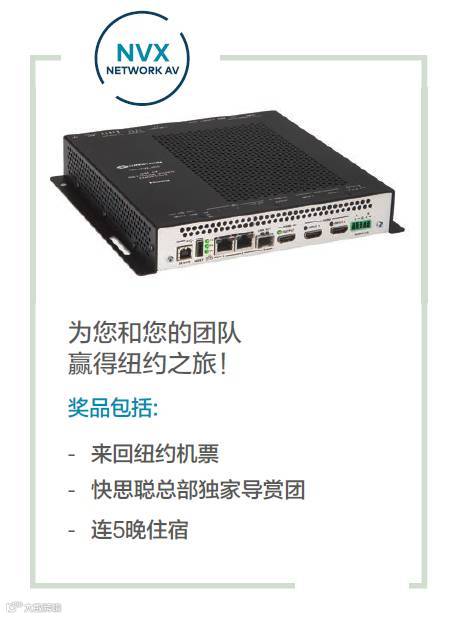 作为全球领先的自动化与控制系统制造商,快思聪于2017年初正式发布业内唯一4K60 4:4:4 HDR解决方案---DigitalMedia™ NVX系列产品。此系列产品可在标准的1Gb以太网传输4K60 4:4:4 HDR视频,且无延迟。DM® NVX系列网络影音解决方案具有无限可扩展性,既支持简单的点到点设置,也支持数以千计的多点传输,只需一台DM NVX编/解码器即可实现。自发布以来,NVX系列产品在全球范围内火热销售,为快思聪全球用户带来无限便捷与高效。为感谢快思聪用户的大力支持,特推出席卷全球的“快思聪NVX带您免费乐游纽约”大型魔幻之旅~~~