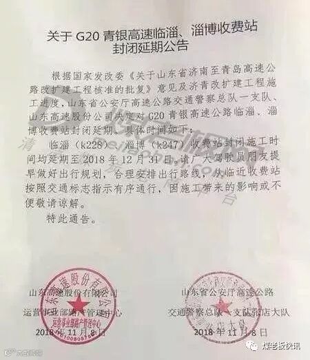 根据国家发改委《关于山东省济南至青岛高速公路改扩建工程核准的批复》意见及济青改扩建工程施工进度,山东省公安厅高速公路交通警察总队一支队、山东高速股份公司决定对G20青银高速公路临淄、淄博收费站封闭延期。具体时间如下: