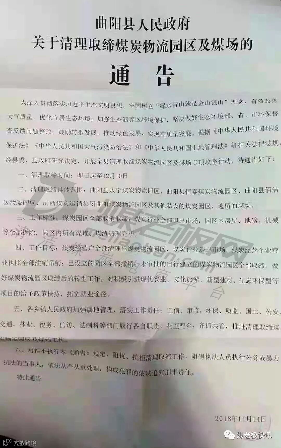 2018年11月14日,河北曲阳县人民政府关于11月14日-12月10日清理取缔煤炭物流园区及煤场的通告。其中工信、市监、环保、质监、国土、公安、交通、林业、税务、信访、法治科等部门履行各自职责,共推清理取缔煤炭物流园区及煤场工作。