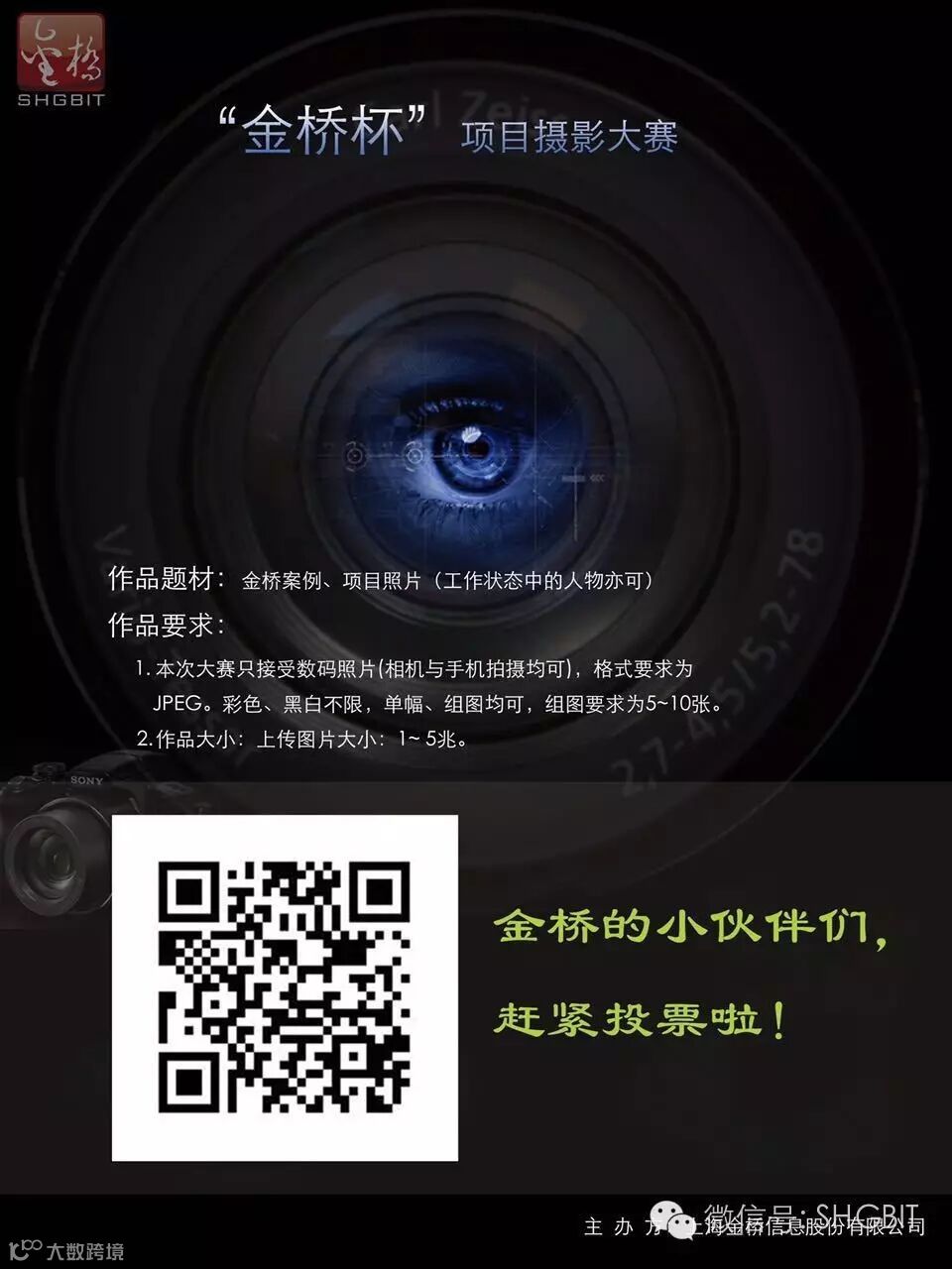 金桥信息SHGBIT“金桥杯”项目摄影大赛自开赛以来,得到一众金桥伐木累的踊跃支持。截至目前,本次大赛共收到15组参赛作品,或展示金桥项目风采,或展示金桥人精神风貌。参赛作品选题精彩纷呈,拍摄手法出神入化!闲话不多说,上图上图,大家扫描下图中的二维码,即可参与投票,请为您心仪的参赛作品投上宝贵的一票吧!(投票即有机会得到精美礼品一份哦!)