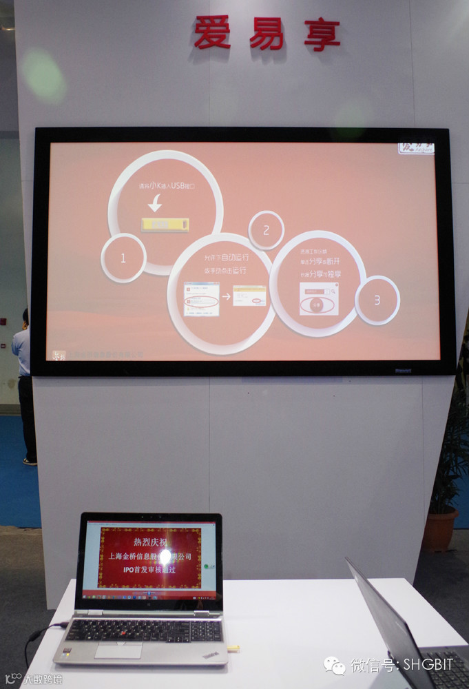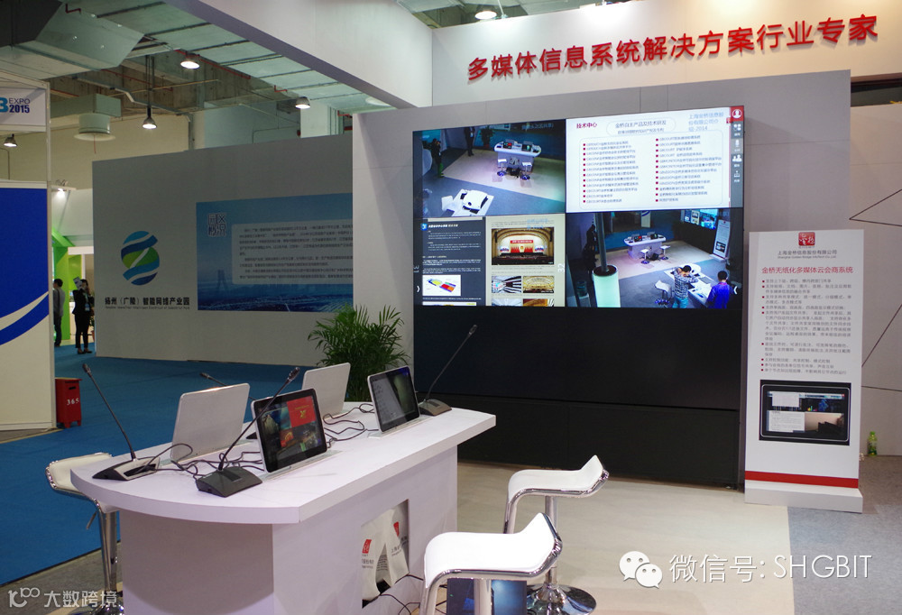 上海金桥搭建了90平米的大型展台,通过自主研发产品无纸化多媒体云会商系统、金桥多媒体信息一体化呈现系统、爱易享等新品的展示与体验、主题演讲、播放公司案例等形式重点展示了金桥多年来在云计算、多媒体呈现、系统集成领域的核心技术,全方位地展现了公司对智慧城市的理念和创新成果,多角度地彰显了金桥强大的自主研发能力与系统集成能力。