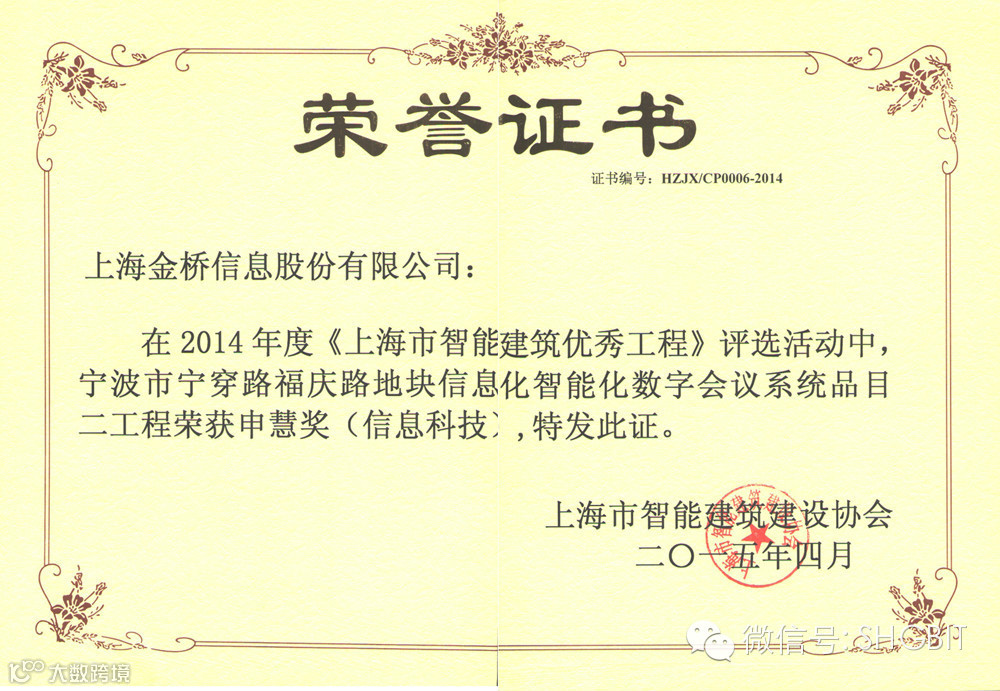 同期上海市智能建筑建设协会还召开了2015年度年会,总结并探讨了行业建设和发展,展示并嘉奖了多项评选成果。上海金桥系统集成部孙莹、杨家骅双双荣获“上海市智能建筑优秀设计师”;上海金桥技术工程部鲁许清、张兴龙分别收获“上海市智能建筑建设行业优秀项目经理”;由上海金桥承建的“宁波市宁穿路-福庆路地块信息化智能化数字会议系统品目二”工程一举斩获2014年度“上海市智能建筑优秀工程”(申慧奖),同时在该项目中做出突出贡献的项目人员黄远洋、李德友、闵小进等也受到表彰。