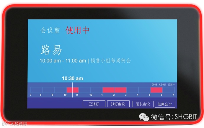 金桥智能会议预约管理平台是一款为政府机关,大中型企事业单位及会议中心设计研发的产品。本系统有会议室资源管理,会议预订管理,会议通知,会议信息展示四大部分组成。采用自主研发的256色LED可变色边框智能触控展示终端,不仅提高的终端的美观效果,而且使会议室的当前使用状况一目了然。用户可通过网络登录本系统网站实时了解会议室使用情况,并预订会议,系统会自动通知参会人员,同时,智能展示终端会实时更新会议信息,根据会议室空闲状况自动变换颜色。用户也可在终端上直接预订会议室、延长当前会议、提前开始或结束会议。本平台可为用户定制展示界面,定制接入用户已有的会议预约管理系统、OA系统、视频电话系统等,提高企业的办公效率。