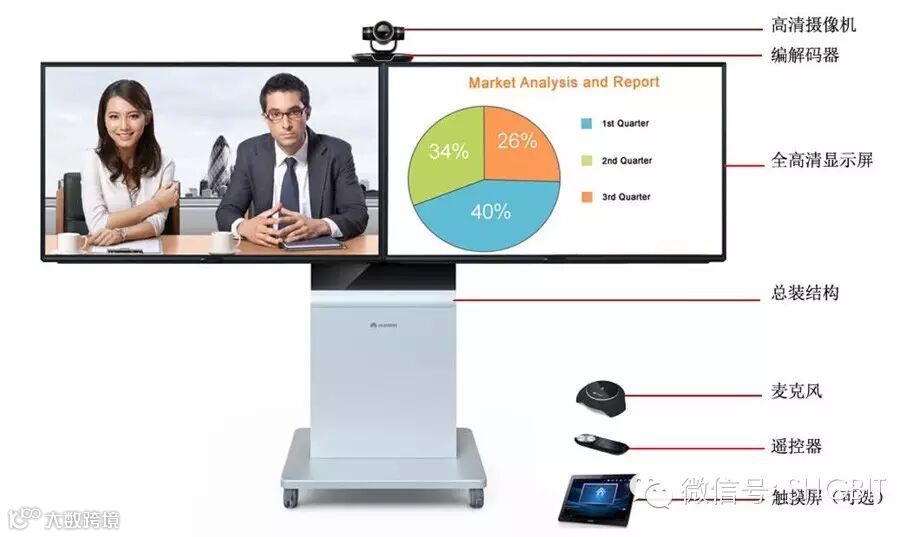 基本组件:全高清液晶显示屏、1080p 核心编解码器、1080p 高清摄像机、麦克风、设备架、遥控器