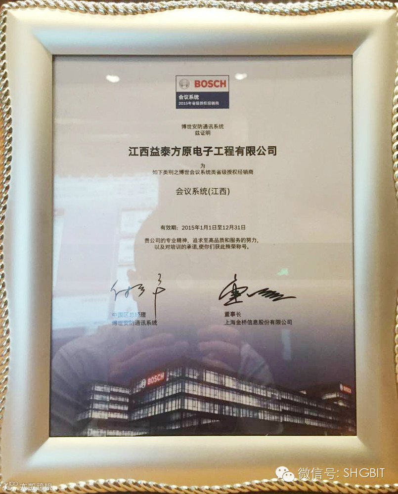 上海金桥信息股份有限公司成为博世会议系统华东与华西区的独家总代理商后,迅速与博世重新部署与优化销售渠道及开拓中国市场;继向武汉昌龙、郑州丽声、重庆富淞发放授权代理证书之后,寥寥数日,上海金桥又成功推进了江西地区销售渠道布局,与江西益泰方原电子工程有限公司联手合作,并正式向其发放授权代理证书,共同开拓江西会议市场。
