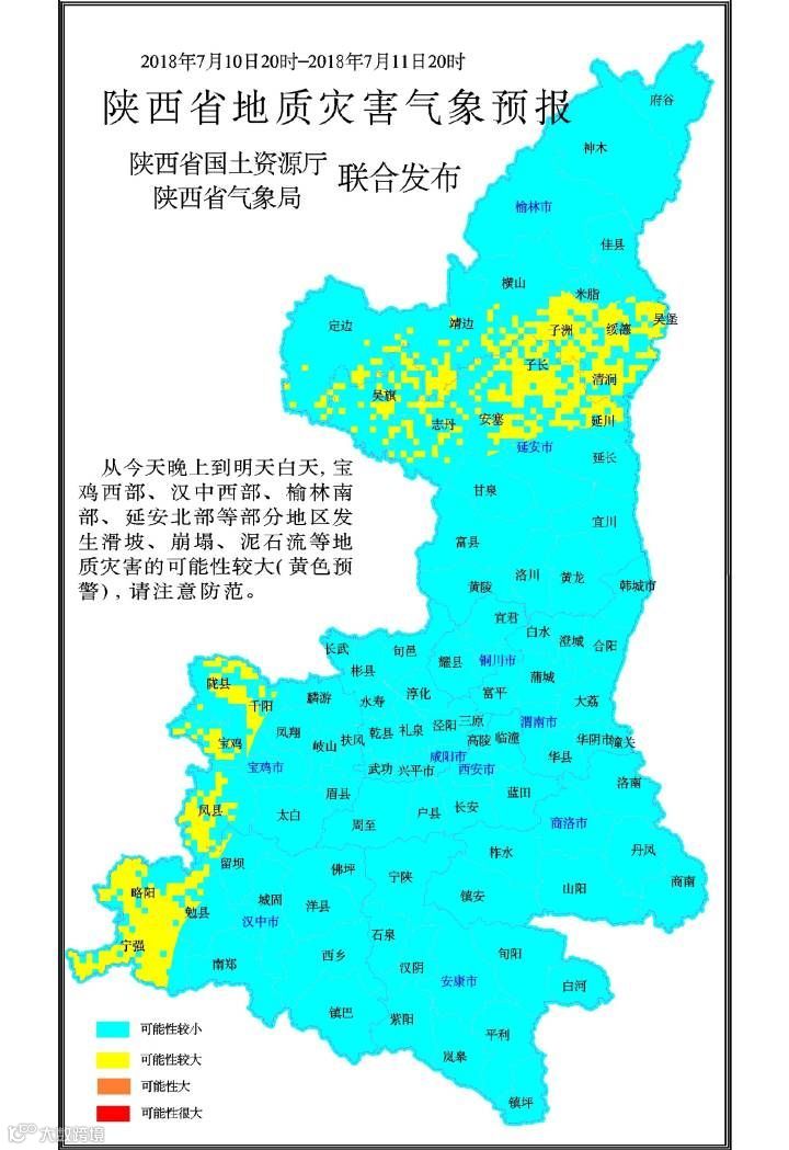 陕西省国土资源厅与陕西省气象局也在10日下午联合发布地质灾害气象风险预警:预计7月10日20时至7月11日20时,宝鸡西部、汉中西部、榆林南部、延安北部等部分地区发生滑坡、崩塌、泥石流等地质灾害的可能性较大,请注意防范。