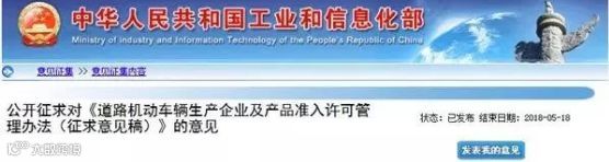 4月18日,工信部发布《道路机动车辆生产企业及产品准入许可管理办法(征求意见稿)》(以下简称《意见稿》),展开一个月的意见征集。